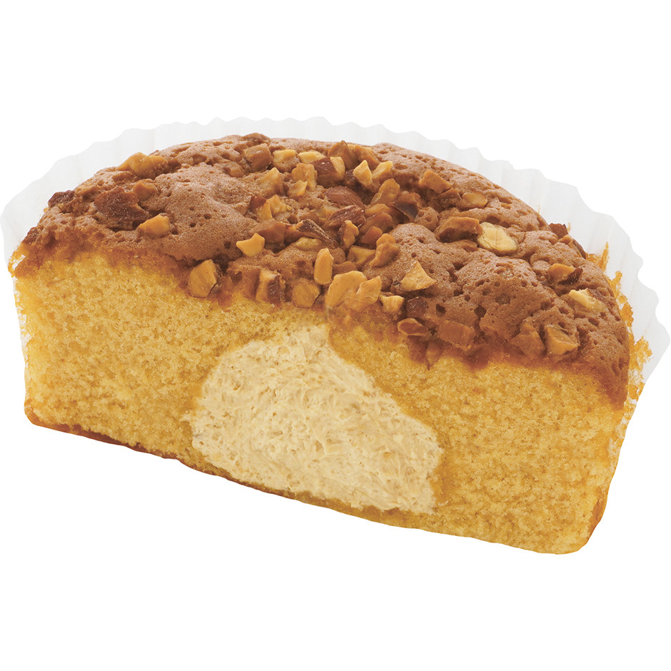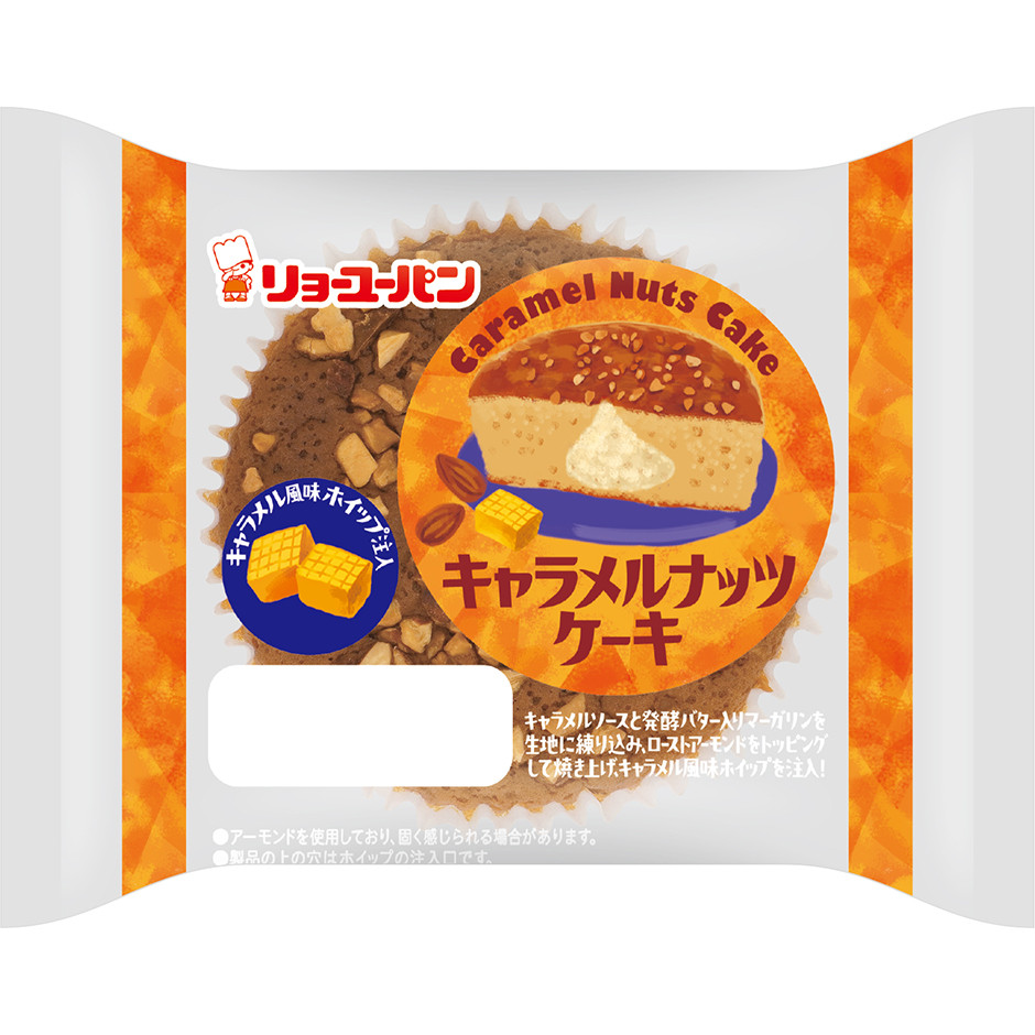 キャラメルソースと発酵バター入りマーガリンを生地に練り込み、ローストアーモンドをトッピングして焼き上げ、キャラメル風味ホイップを注入しました。